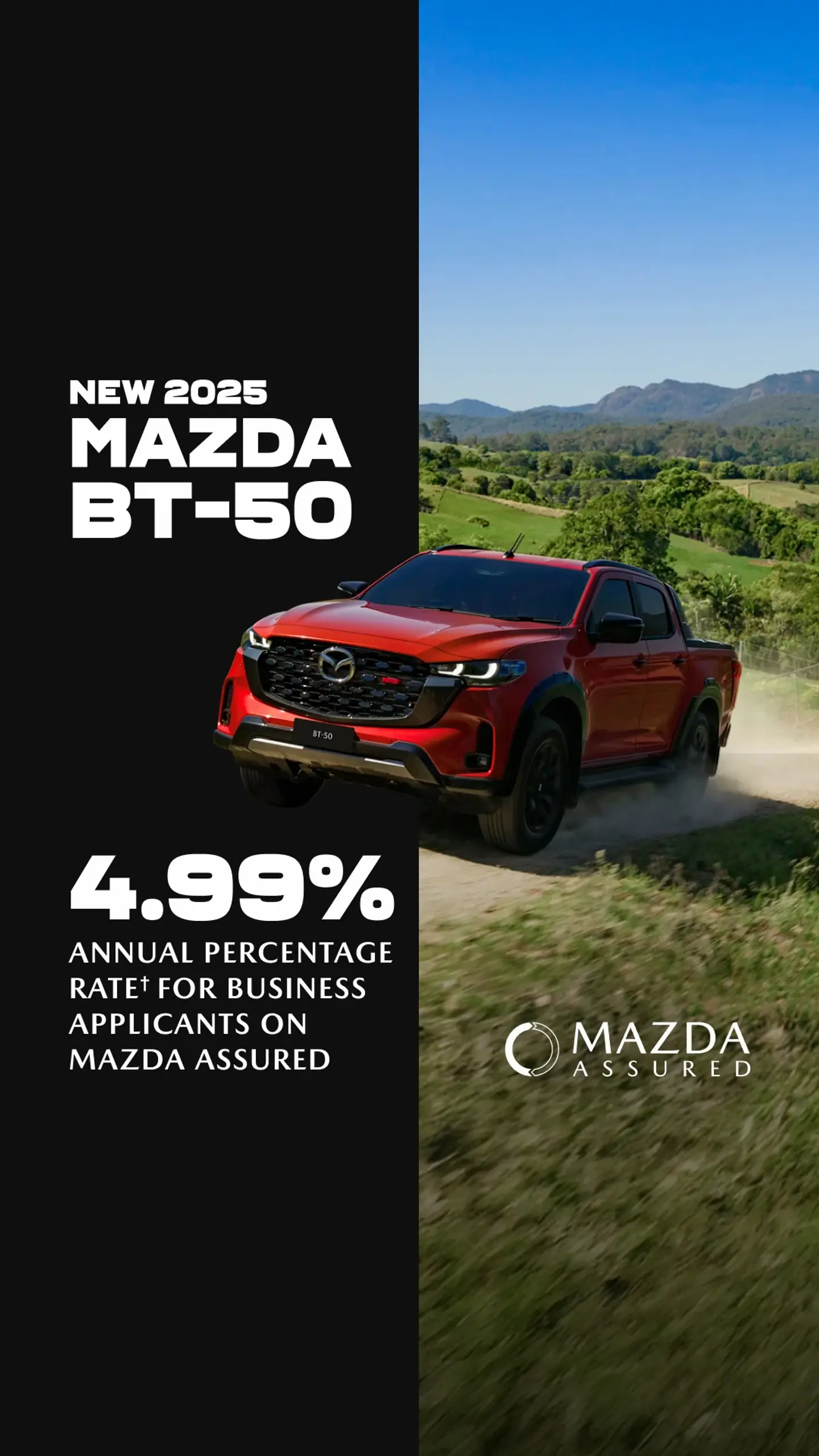 With Mazda Assured, you can get the New 2025 Mazda BT-50 at an annual percentage rate of just 4.99%† for approved business customers.